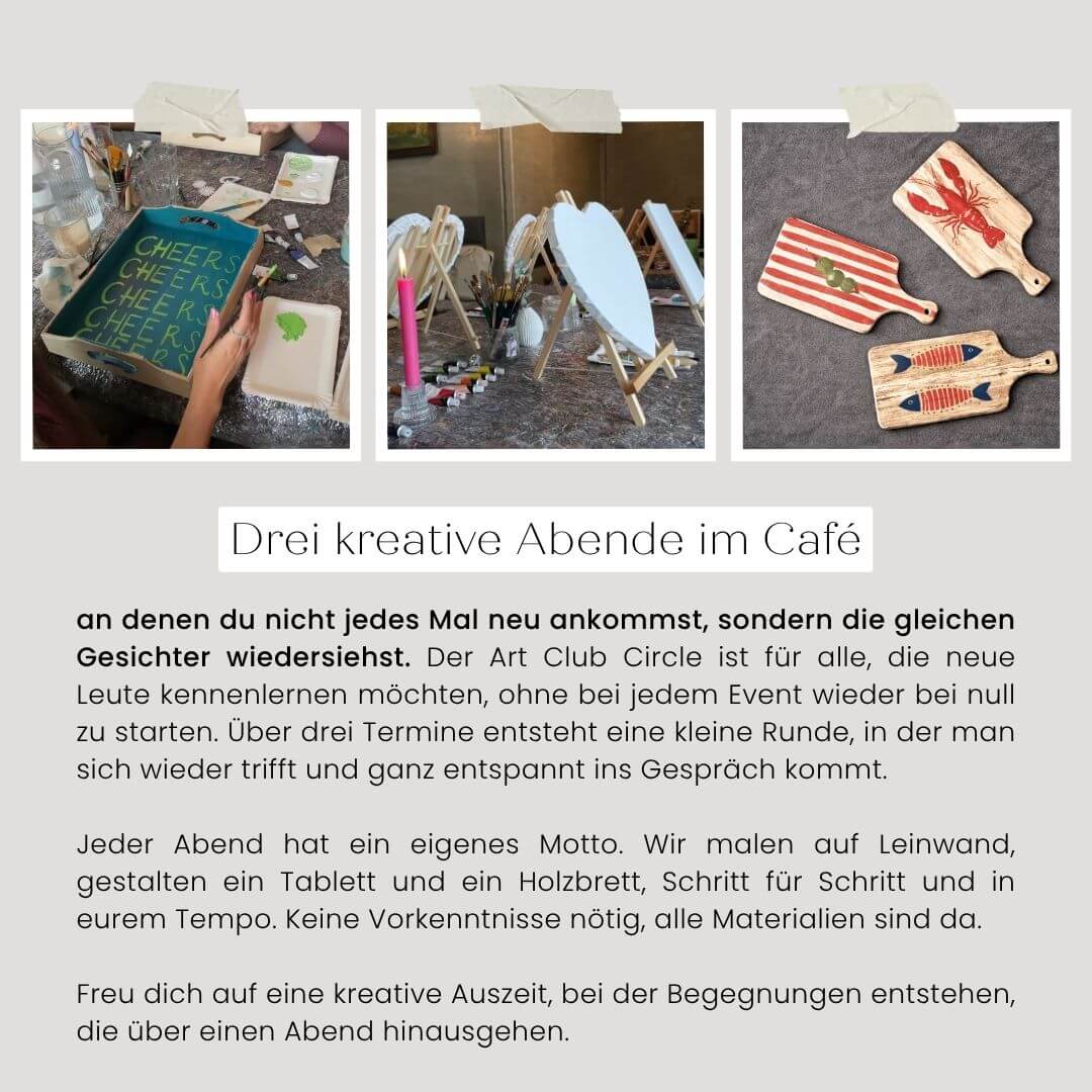 Wenn du dir drei Abende wünschst, auf die du dich freuen kannst, an denen du kreativ bist und gleichzeitig neue Menschen kennenlernst, dann ist der Art Club Circle genau das Richtige für dich.