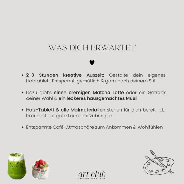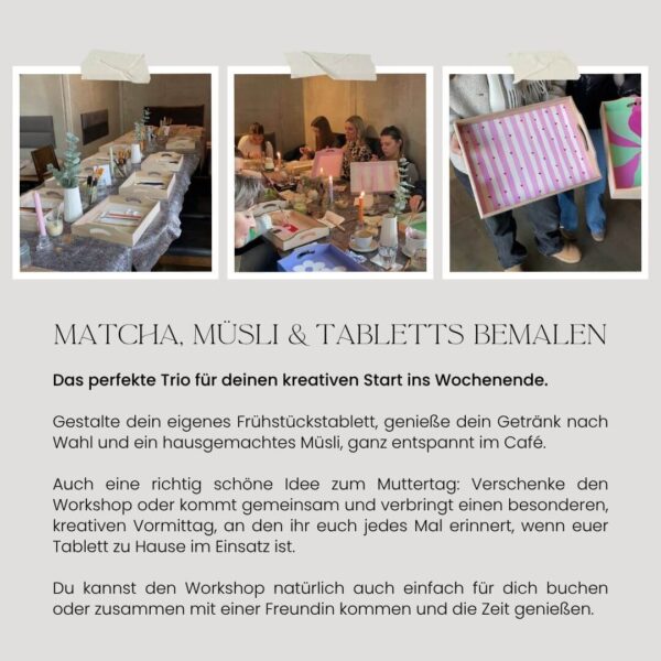 Verschenke einen Gutschein und kommt zusammen zum Matcha & Paint. Zusammen an einem Tisch sitzen, Matcha oder Kaffee trinken (bestellt das, worauf ihr Lust habt), malen, lachen, kein Stress, kein Plan und einfach ein paar Stunden, die nur euch gehören. Am Ende nehmt ihr ein selbst gestaltetes Tablett mit nach Hause, das euch immer wieder an diesen Vormittag erinnert.